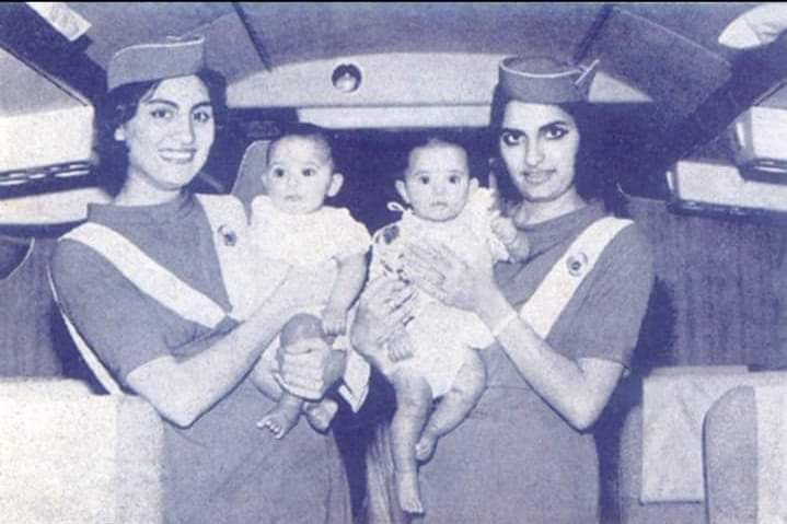 PIA’s legendary Air Hostess Momi Gul Durrani (left) with Air Hostess Rashida photographed aboard a PIA Boeing 720-040B after arriving at Karachi Airport from London in August 1962. The two Air Hostesses are holding twin babies Fahim Ahmed and Susane Ifrah. Born on March 11, 1962, the twin babies, a girl and a boy, became the jet travelers at the early age of 5 months by undertaking 4,500 miles journey by air unaccompanied by their parents. They arrived in Karachi on a PIA flight from London and took the connecting flight to Rawalpindi twenty minutes later, adding another 700 miles to their flight log.